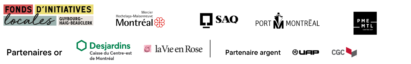 L’arrondissement Mercier-Hochelaga-Maisonneuve, La Société des alcools du Québec (SAQ) et l’Administration portuaire de Montréal, La Caisse Desjardins du Centre-Est de Montréal, La Vie en Rose, UAP CGC et PME MTL Centre-Est.
